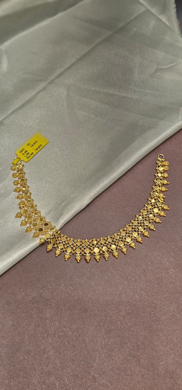 A necklace is more than an ornament – it is the crown of elegance, adorning every moment with beauty and charm. At Omkar Jewellers, our gold necklaces are crafted with precision, hallmarked purity, and timeless artistry. From delicate daily-wear chains to grand bridal haars, each piece reflects a perfect blend of tradition and contemporary style.